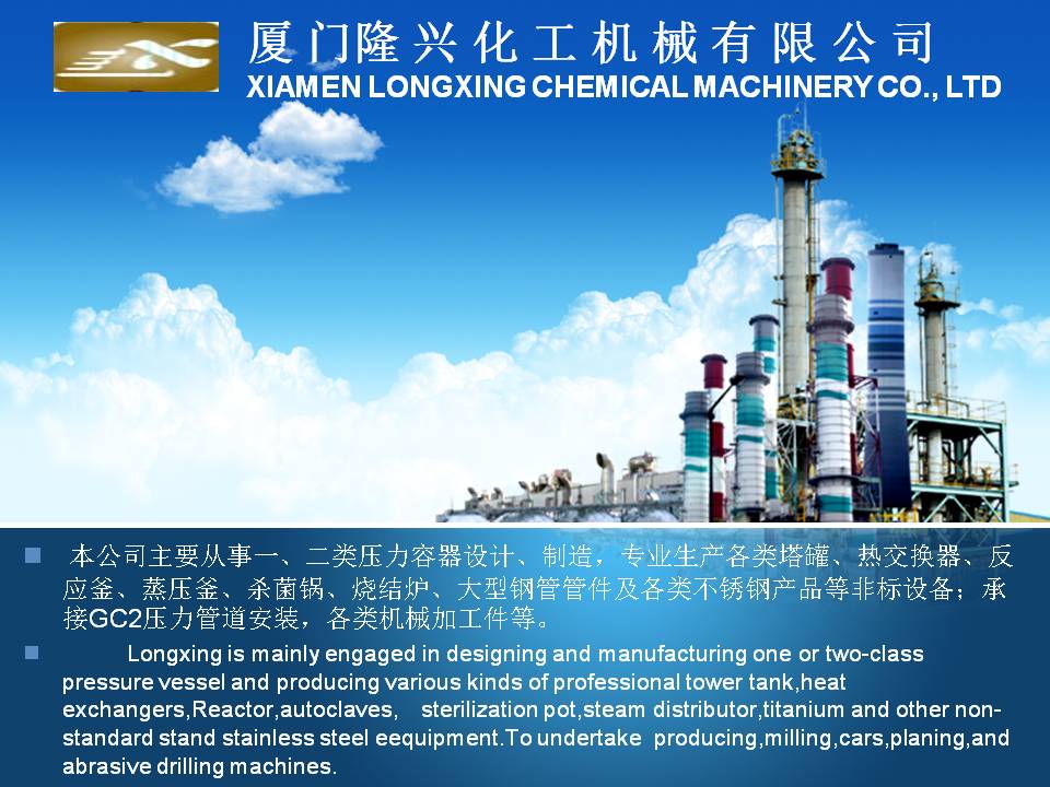 廈門隆興化工機械有限公司成立于2001年5月,占地面積30000平方米,擁有生產(chǎn)車間面積10000平方米及相關(guān)配套的辦公場所3000平方米,其中下料場所1000平方米,不銹鋼制作場所2000平方米,ASME產(chǎn)品制作區(qū)域1200平方米,無損曝光室30平方米。公司有職工135人,擁有專業(yè)的技術(shù)人員和管理人員36人。公司主要從事設(shè)計、制造A2級覆蓋D類壓力容器...